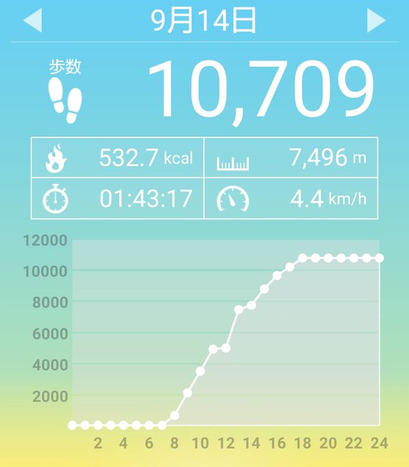 9月14日(月曜日)の歩数は10709歩、消費カロリーは537キロカロリー。 pic.twitter.com/cE3emHkLQl