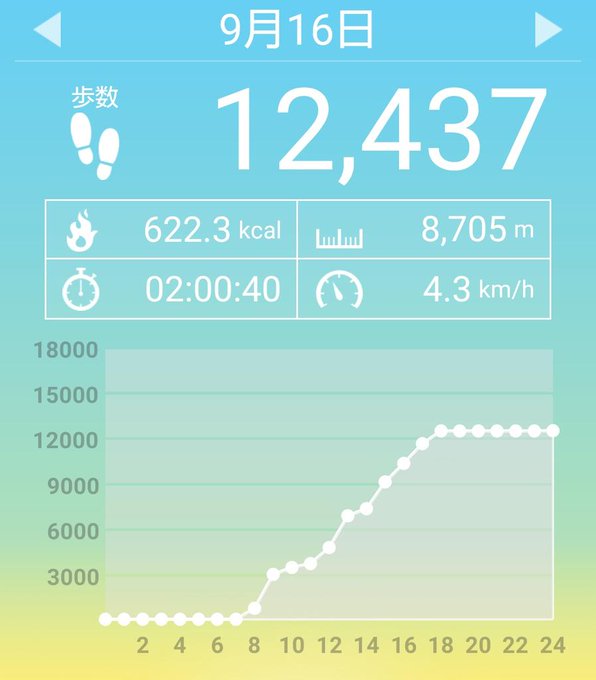 9月16日(水)の歩数は12437歩、消費カロリーは622キロカロリー。 pic.twitter.com/99dLWwaYYd