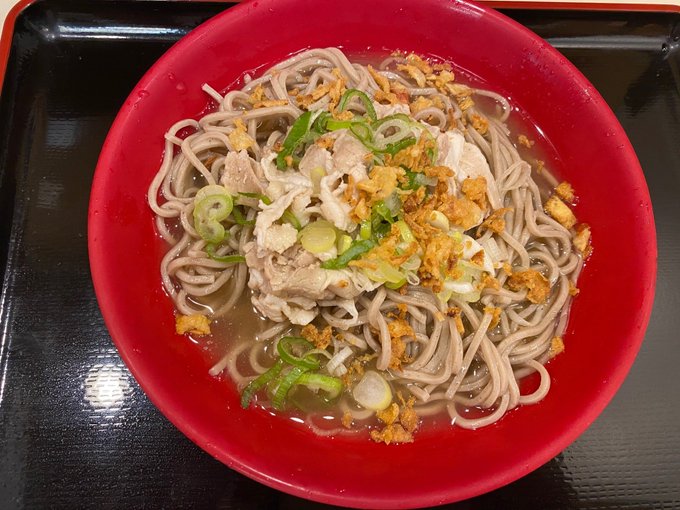 山形県の冷たい肉そば、2020/09/17のケンミンSHOWでやってた。鶏油浮いてるスープに少し硬めの蕎麦、あれ?ラー油系の蕎麦ってこういうのがベース? / “山形田 - 銀座/そば [食べログ]” htn.to/3M3yQSc85p