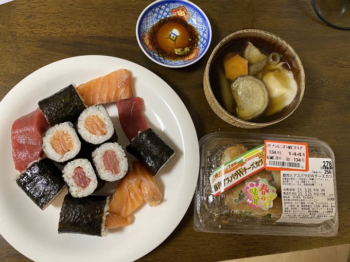 夕飯はロピアで買ってきたマグロとサーモンの巻き寿司、根菜類と水餃子のスープ、西友で、買ってきた豚肉とアスパラのWチーズカツ等。 pic.twitter.com/mVr2NxldGU