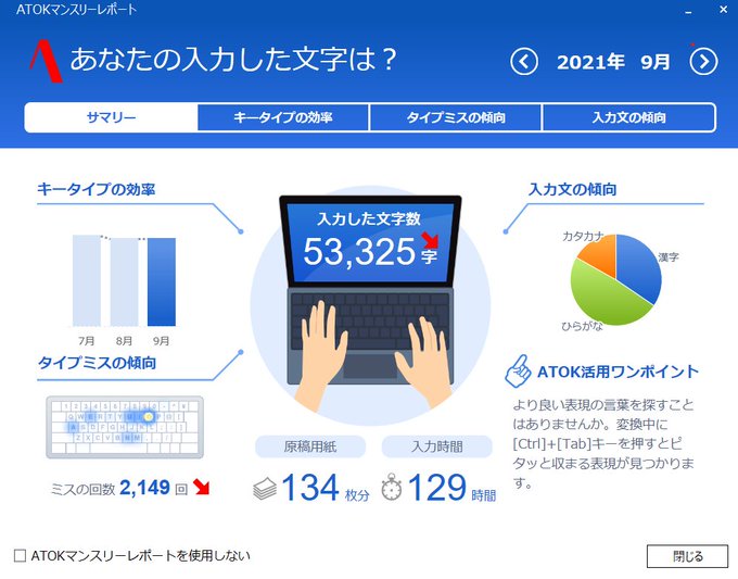 2021年9月ATOKマンスリーレポート。入力した文字数は53325字。 pic.twitter.com/iFXAe3znK8