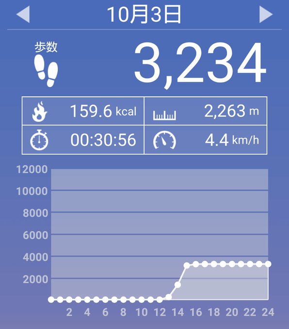 10月3日(日)の歩数は3234歩、消費カロリーは159キロカロリー。 pic.twitter.com/nKMwKqpaZQ