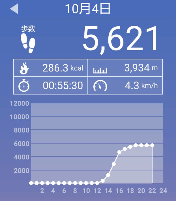 10月4日(月)の歩数は5621歩、消費カロリーは286キロカロリー。 pic.twitter.com/9oNZCBeVSm