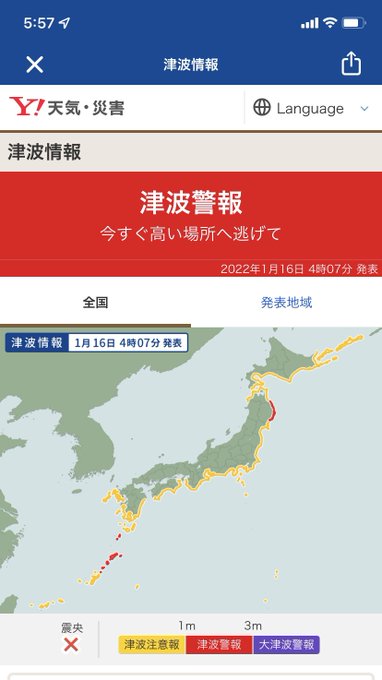 RT @UN_NERV: 🔊音声あり 【津波情報 2022年1月17日】 津波予報(若干の海面変動)を発表しました。 [震源に関する情報] 15日13時10分頃、南太平洋を震源とする地震。震源の深さは不明、地震の規模はM不明と推定。 pic.twitter.com/o8HUGyMKFJ