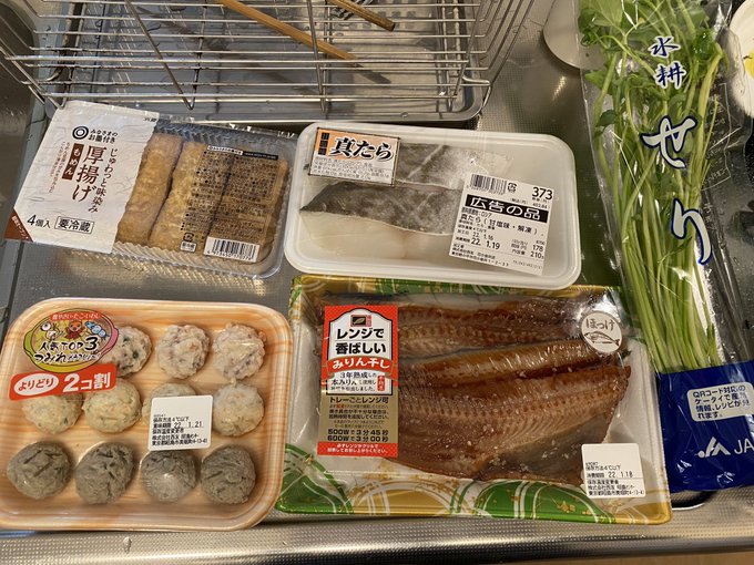 西友でみなさまのお墨付き 味染み厚揚げ もめん、真だら、鶏やさい・たこ・いわし 人気TOP3 つみれどうでしょー!、レンジで香ばしいみりん干し ほっけ等を買って来ました。今日使うのはほっけや厚揚げぐらい。このホッケ、電子レンジ調理可能。このトレイごと電子レンジに入れてチンするだけです(ラップには爪楊枝なので5~6個ぐらい穴あけてから)。