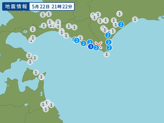 RT @UN_NERV: 【緊急地震速報 第3報 2022年5月22日】 21時22分頃、日高地方東部を震源とする地震がありました。地震の規模はM4.6程度、最大震度3程度と推定されています。この情報は気象庁の予報に基づく推定です。情報は誤差を含む場合があります。