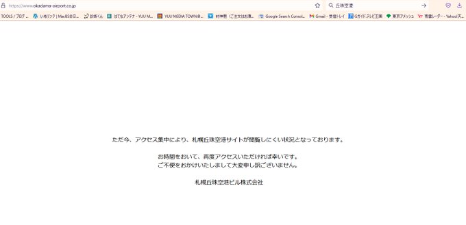 本当だ、丘珠空港のサイトにアクセスするとこれが表示される。 www.okadama-airport.co.jp 丘珠空港でそんなアクセス集める事はねえよなぁ・・・・ pic.twitter.com/578slL9kl8