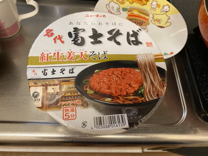 朝飯はニュータッチ 名代 富士そば 紅生姜天そば、野菜ジュース、その他 pic.twitter.com/FGOulNDVkn