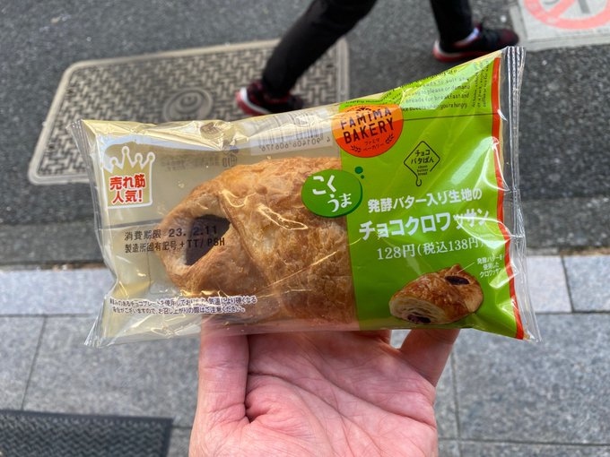 ファミマベーカリー(FAMIMYA BAKERY)こくうま チョコ バタぱん 発酵バター入り生地のチョコクロワッサン食べる。あれ?前も書いたかもしれないけどチョコ好きのためのチョコクロワッサンという名前、変ったんやね。