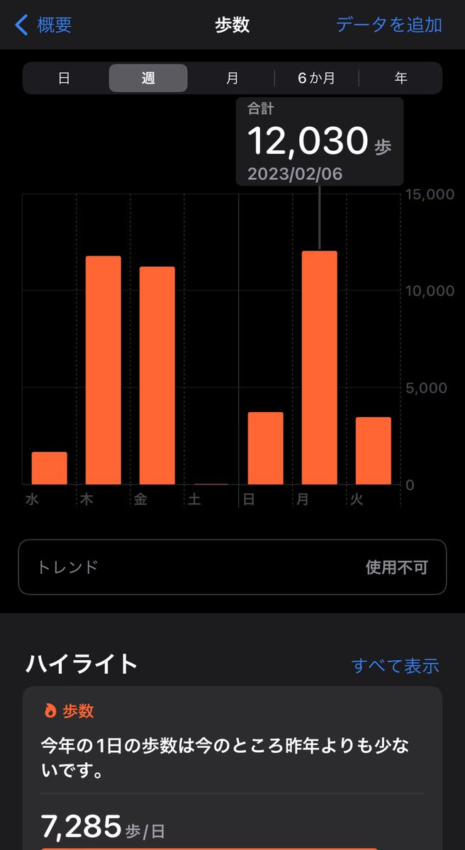 2023年2月1日(水曜日)の歩数は1653歩、2日は11785歩、3日は11215歩、4日は25歩、5日は3720歩、6日は12030歩、7日は3466歩。 pic.twitter.com/qnYqJF0kKc