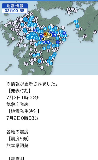 7月2日1時00分には震源地は熊本県阿蘇地方で震源の深さは11km、マグニチュードは4.5、震度5弱の地震が起きました。