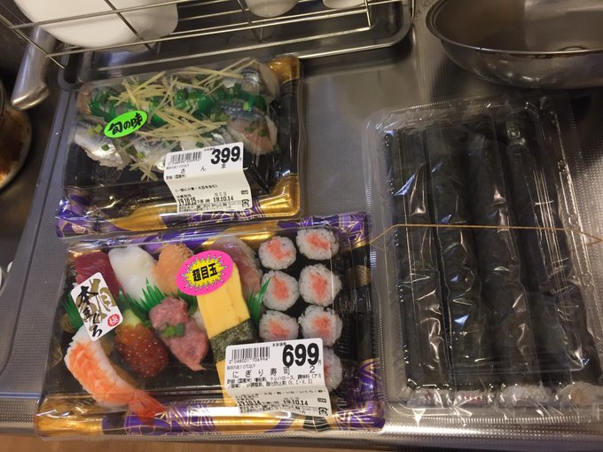 西友で買ってきたハロウィン飾り寿司(ツナととびっこ、タマゴマヨ、ねぎとろあくら、サーモンいくら等)やいか唐揚げやシークヮーサーもずくとか食べまして。