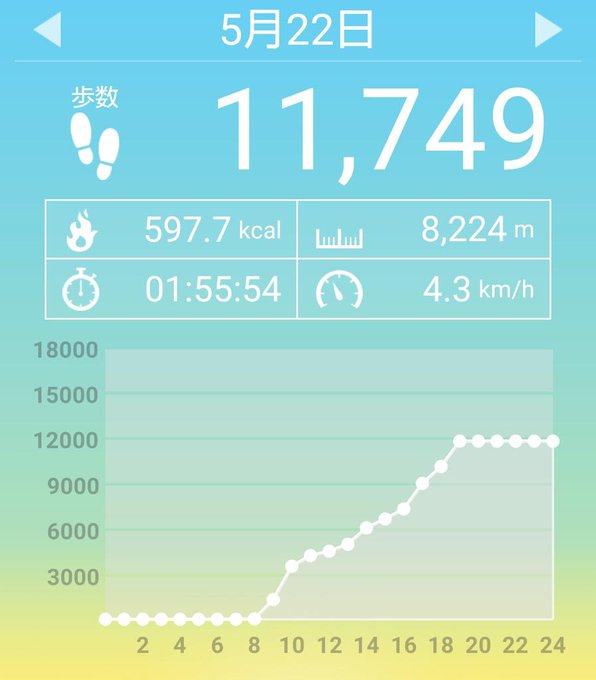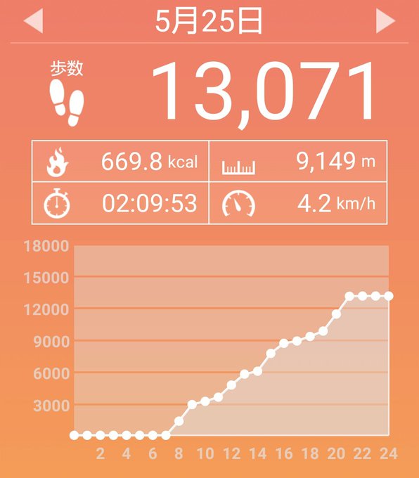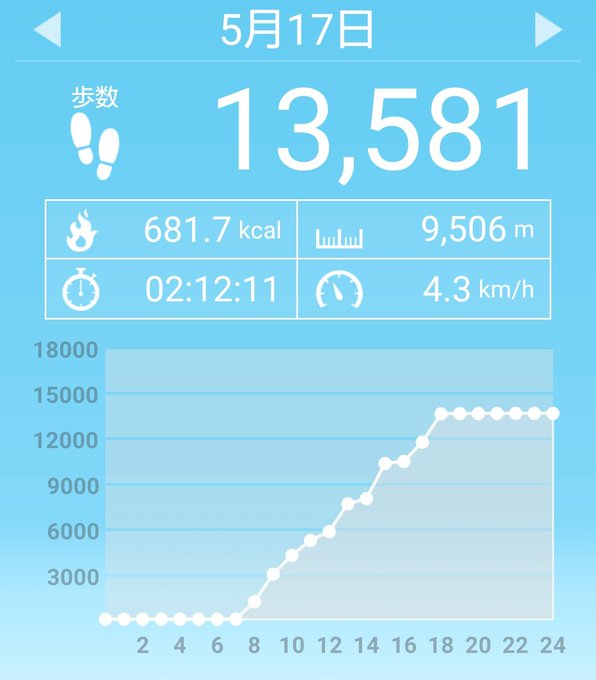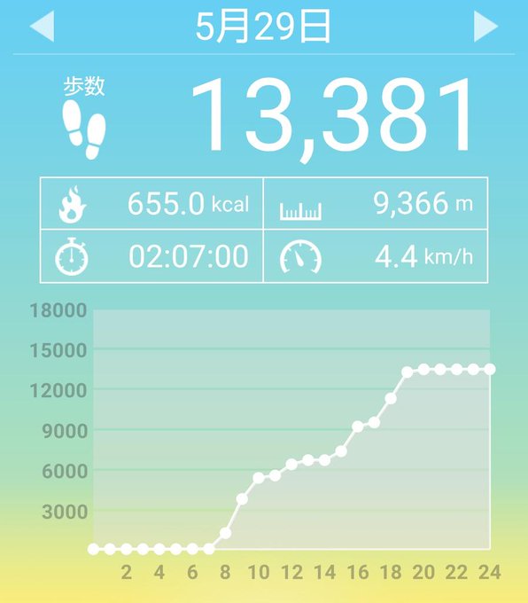 5月29日(土)の歩数は13381歩、消費カロリーは655キロカロリー。 pic.twitter.com/rkopRm5k1O