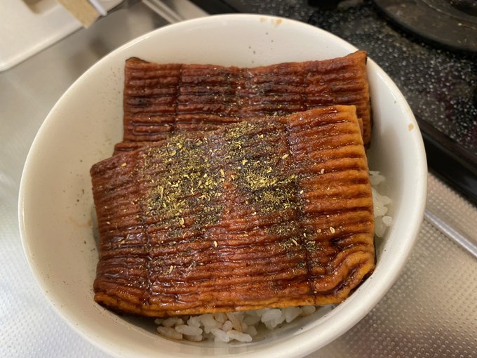完成。魚のすり身感は当然するけどタレ多めにかけりゃ、だいぶ鰻っぽく?なるよね。