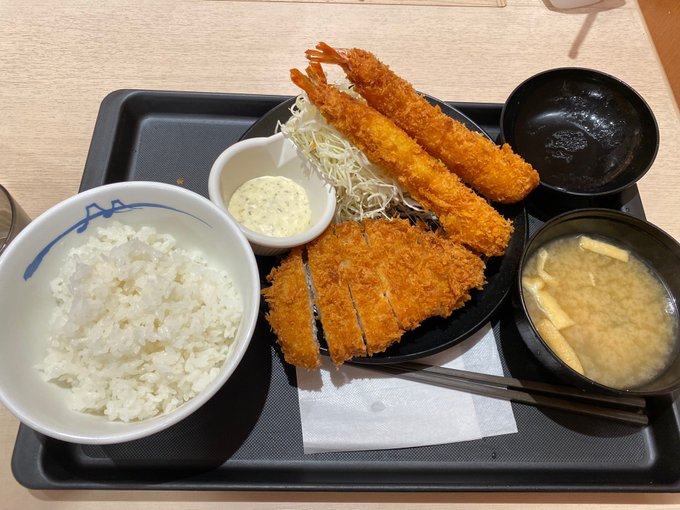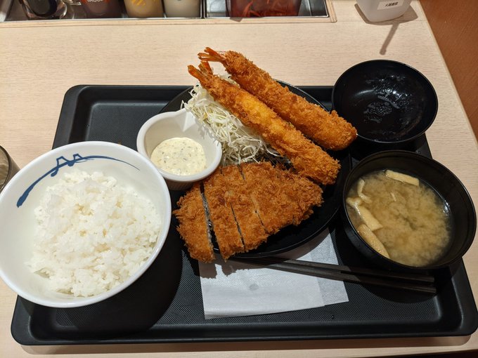 昼飯は海老2セール ロースかつ&海老フライ2尾定食、通常1040円のところ840円。美味かった、エビがでかい、柔らかい。 (@ 松のや - @matsu_noya in 大田区, 東京都) www.swarmapp.com/c/dDVEbxc96ej pic.twitter.com/PZD77vliu8