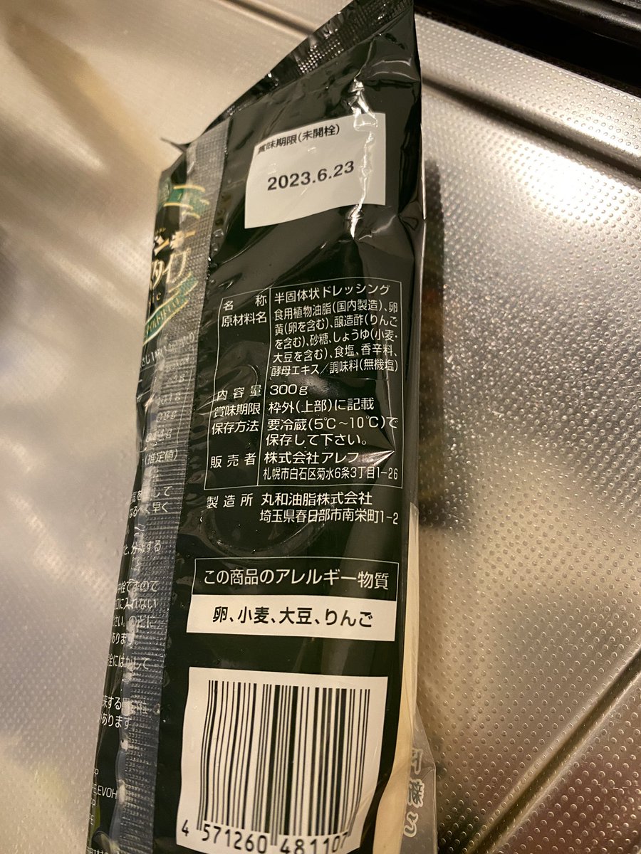 食用植物油脂(国内製造)、卵黄(卵を含む)、醸造酢(りんごを含む)、佐藤、しょうゆ(小麦、大豆を含む)、食塩、香辛料、酵母エキス、調味料(無機塩)ですな。