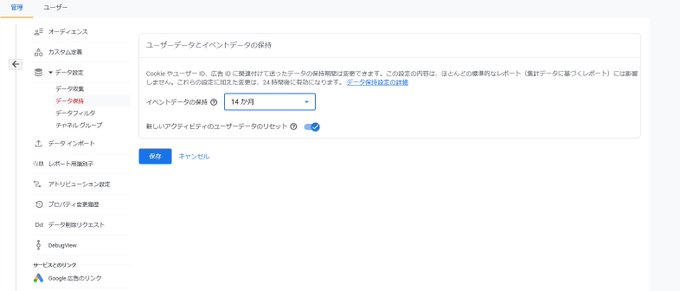 初期設定、タグの埋め込みはしているものの「Googleシグナルのデータ収集」とか「イベントのデータ保持」は知らんかったな。標準ではオフとデータ保持は2ヶ月設定だそうな(標準レポートで表示される数値は永続的に保存が標準で可能)