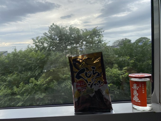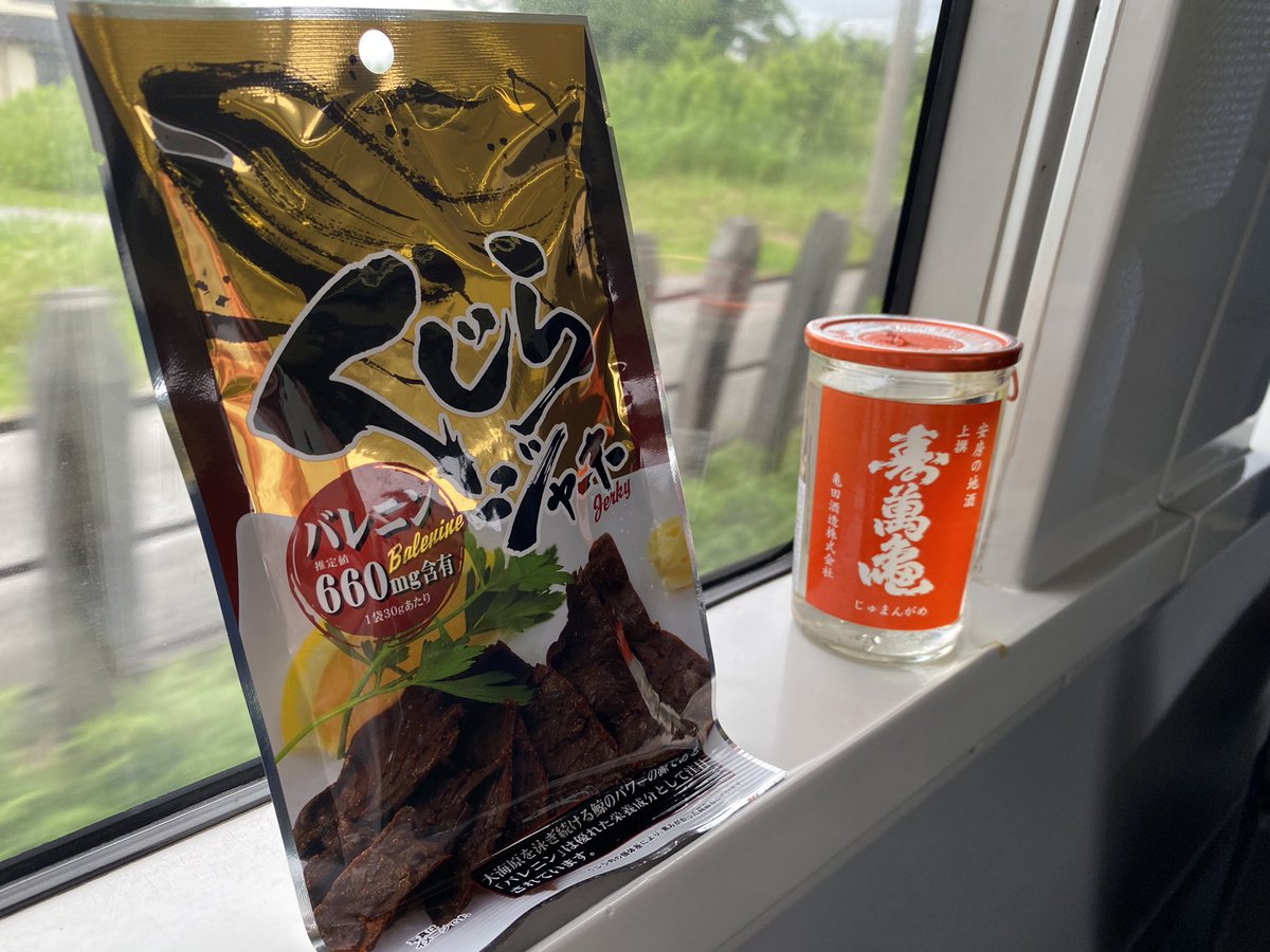 特急で日本酒、旅って感じですなぁ・・・・日本酒も美味しゅうございました。くじらジャーキー、350円のわりには結構、量が入ってた。