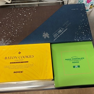 白い恋人(ホワイト&ブラック)24枚入、ロイズ バトンクッキー[ココナッツ25枚入] 、ロイズ 生チョコレート[抹茶]を買ってきました。